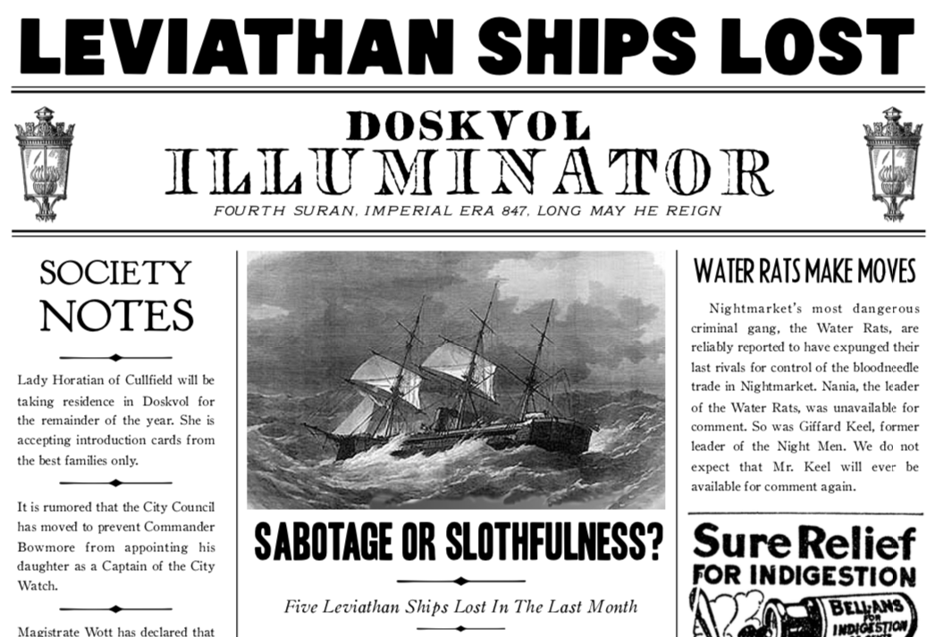 The advertisements are mostly just from Google searches on “Victorian advertisements”. It takes a bit of poking around but you can find useful things. The tricky bit was cropping out inappropriate locations: there’s no place called St. Louis in the city of Doskvol.