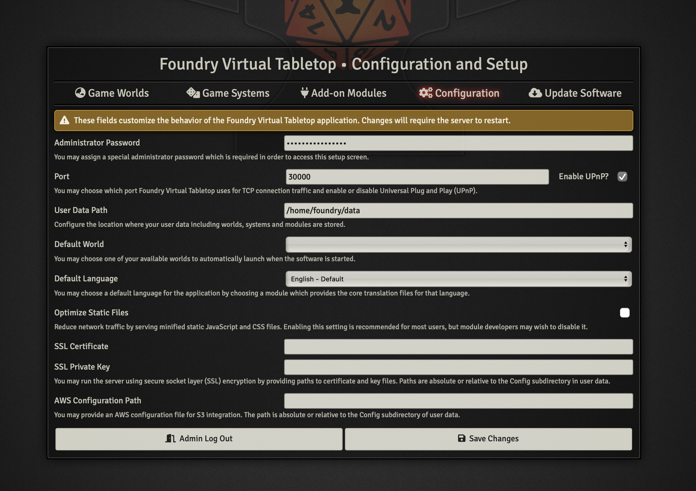 This will launch the Web site in your browser. Enter your license key and accept the license agreement. Then click on Configuration and enter an Administrator Password. Finally, click the Save Changes button. FoundryVTT will ask you if you’re sure. You are.