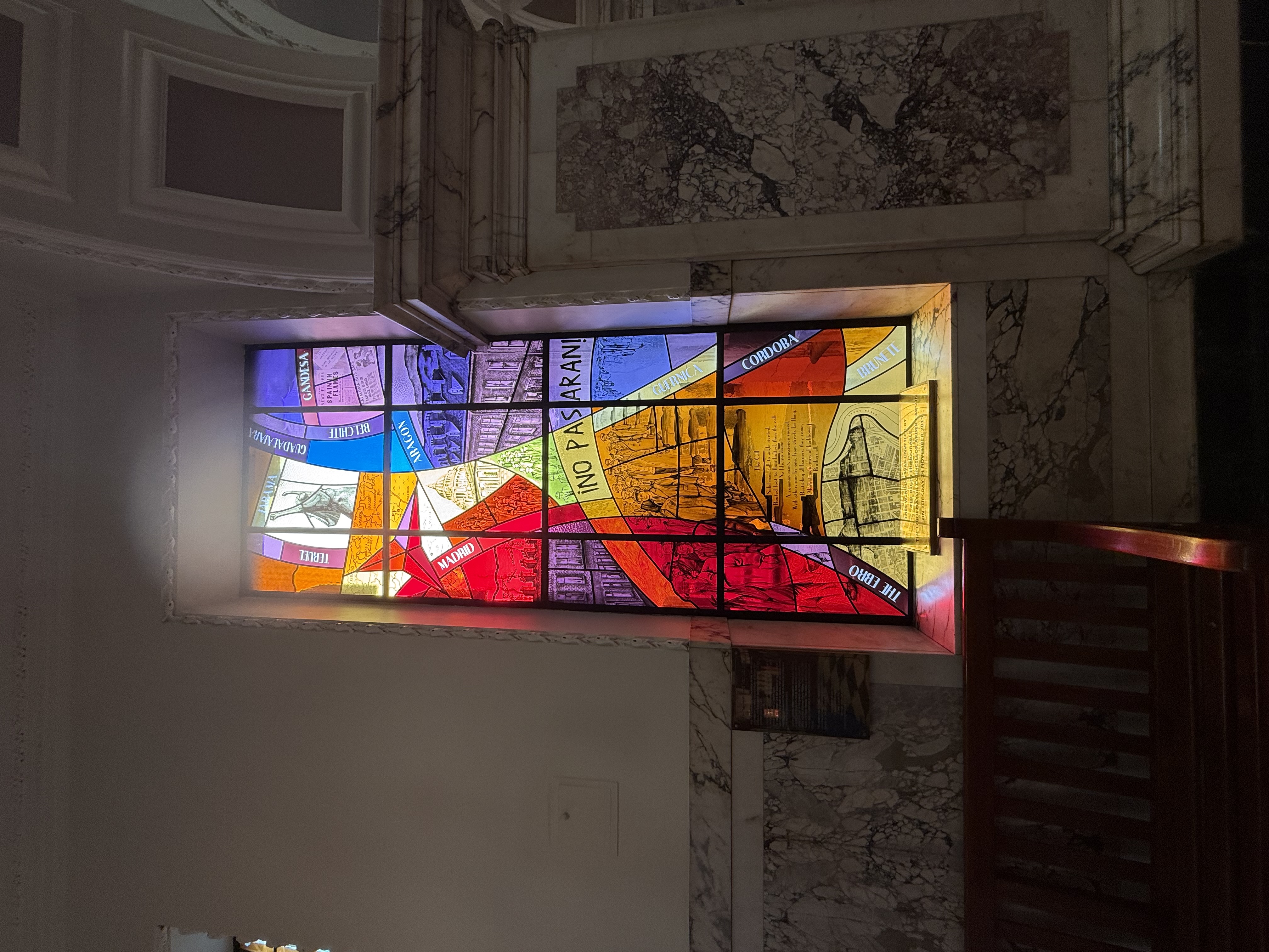 So I did a quick breeze into Belfast City Hall to use the restroom (awesome building and I wouldn’t mind spending time in the visitor exhibition). There are these cool stained glass commemorative windows, one of which confused me a bit: it’s a celebration of the Republican side of the Spanish Civil War. No Pasaran! That sort of aggressive pro-socialist anti-fascist stance is something I associate more with Irish nationalism than Northern Ireland’s unionists; turns out that Belfast unionists feel an affinity with the Spanish Republicans because the Catholic Church in Spain supported the Nationalists. You learn something every day.
